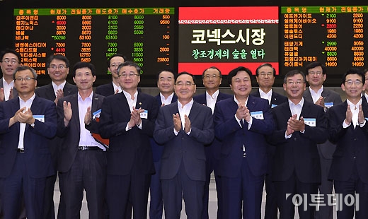 정홍원 국무총리가 17일 초기 성장형 중소기업 전용 주식시장인 '코넥스' 활성화를 위해 여의도 한국거래소를 방문했다. 정 총리가 김진규 이사장 직무대행, 정찬우 금융위 부위원장 등 내빈들과 함께 기념촬영을 하고 있다. 양지웅 기자 yangdoo@