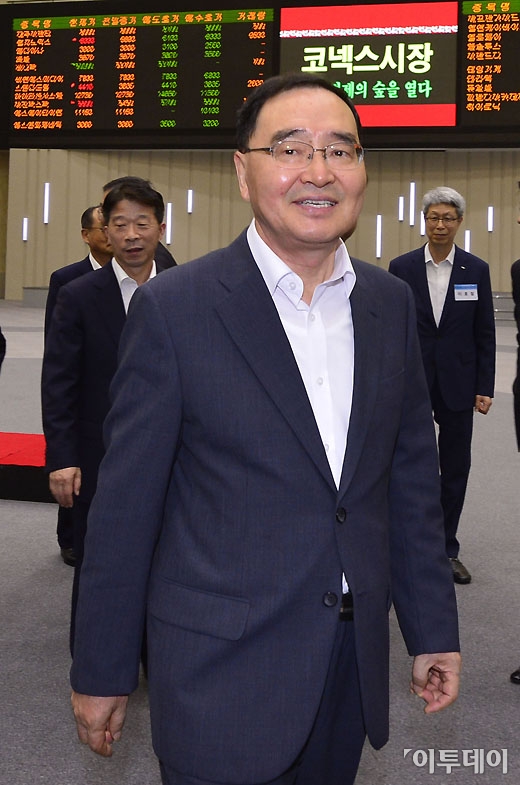 정홍원 국무총리가 17일 초기 성장형 중소기업 전용 주식시장인 '코넥스' 활성화를 위해 여의도 한국거래소를 방문하고 있다. 양지웅 기자 yangdoo@