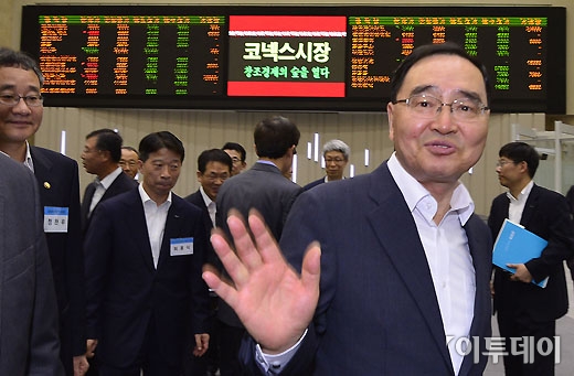 정홍원 국무총리가 17일 초기 성장형 중소기업 전용 주식시장인 '코넥스' 활성화를 위해 여의도 한국거래소를 방문하고 있다. 양지웅 기자 yangdoo@