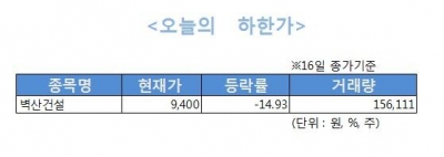 17일 국내 주식시장에서는 유가증권시장 상장종목인 벽산건설만이 하한가를 기록했다.