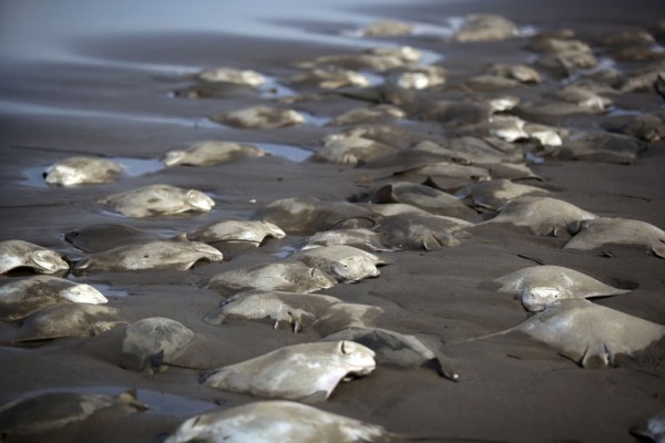 16일(현지시간) 멕시코의 멕시코만 우르술로 갈반 차찰라카 해변에 죽은 노랑 가오리들이 널려 있다. 최소 250마리의 이 버려진 가오리들은 현지 어부들이 간식용으로 이용되는 노랑가오리가 제 값을 받을 수 없게 되자 해변가에 버린 것으로 밝혀졌다.