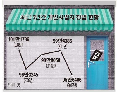 개인사업자 창업은 지난 2008년 101만1736명에서 2009년 96만3245명으로 떨어진 뒤 2010년 98만8058명, 2011년 99만4386명으로 2년 연속 늘었다.