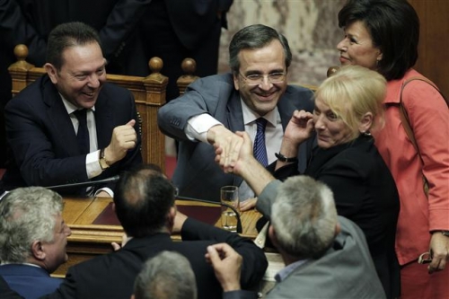 야니스 스투나라스 재무장관(맨 왼쪽)과 안토니스 사마라스 그리스 총리(가운데)가 18일(현지시간) 의회 표결 이후 의원들의 축하를 받고 있다. 이날 그리스 의회는 유럽연합(EU)와 국제통화기금(IMF)의 구제금융을 받기 위한 조건인 공무원 구조조정 등을 포함한 개혁안을 통과시켰다. 아테네/AP연합뉴스