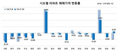 시도별로는 △서울(-0.14%), △강원(-0.11%) △전남(-0.10%) △대전(-0.08%) △부산(-0.07%) △경남(-0.06%) 등의 순으로 가격 하락을 주도했다.