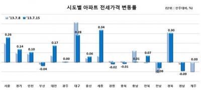 시도별로는 △세종(0.34%), △경북(0.30%), △대구(0.28%), △서울(0.26%), △대전(0.17%), △경기(0.14%) △인천(0.10%) 등이 상승했다.