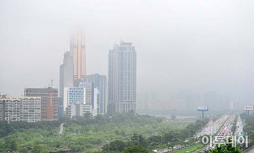 장마가 잠시 소강상태를 보인 18일 오전 서울 영등포구 여의도 63빌딩 상층부가 안개에 휩싸여 있다. 방인권 기자 bink7119@