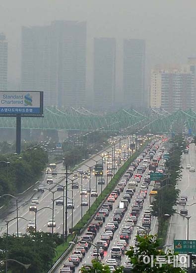 장마가 잠시 소강상태를 보인 18일 오전 서울 영등포구 여의도 63빌딩 상층부가 안개에 휩싸여 있다. 방인권 기자 bink7119@