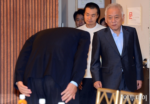 김웅 남양유업 대표이사가 18일 오전 중림동 LW컨벤션에서 열린 남양유업 대리점협의회 협상타결 기자회견에서 김한길 민주당 대표와 이창섭 피해자대리점협의회 회장 등이 참석하자 허리 숙여 인사하고 있다. 노진환 기자 myfixer@