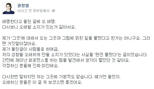 그럼에도 불구, 논란이 확산되자, 권정열은 “해명한다고 올린 글에 또 해명. 다시 보니 오해할 소지가 있는거 같아서요. 제가 그 곳에 대해서 또는 그 곳과 그 팀에 얽힌 일을 몰랐다고 한거는 아니구요. 그러면 거짓말이잖아요. 제가 올린글이 사람들로 하여금, 저의 성향을 오해하게 만들 소지가 있었다는 사실을 완전 몰랐다는 글이었습니다. 간만에 재미난 퍼포먼스를 하는 팀을 발견해서 생각이 짧았던 것 같아요. 걱정하신 분들께 진짜 미안해요. 다시 한번 말하지만 저는 그곳에 가본적도 없습니다. 얘기만 들었지. 오해하신 분들은 이 글 꼭 보셨으면 좋겠어요”라고 게재했다.
