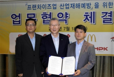 ▲롯데리아가 18일 서울 서초동의 엘타워에서 한국산업안전보건공단과 프랜차이즈업 산업재해예방을 위한 업무협약식을 체결했다. 좌측부터 ㈜롯데리아 한재덕 영업지원담당 매니저, 한국산업안전보건공단 백헌기 이사장, ㈜롯데리아 이호우 햄버거 부문장.