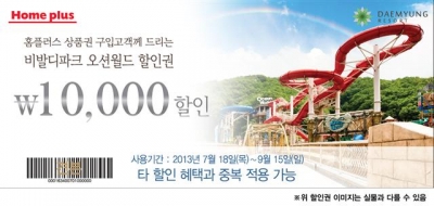 홈플러스는 대명 비발디파크 오션월드와 제휴를 맺고 홈플러스 상품권 10만원 이상 구매 시 오션월드 1만원 할인권 증정 행사를 실시한다고 19일 밝혔다.