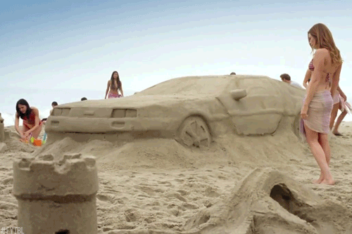 사진에서 한 아름다운 여성이 모래로 조각된 자동차를 보고 있다. 이어 모래로 만든 자동차의 문이 열리며 그 안에서 한 남성이 음료를 마시며 여성을 유혹하는 눈길을 보낸다.