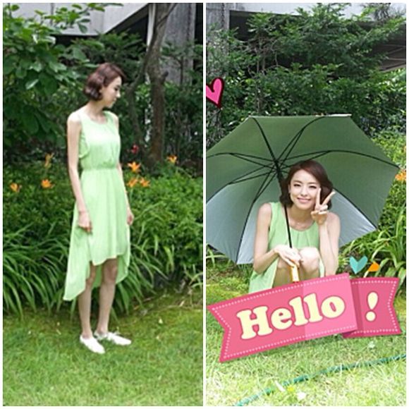 공개된 사진 속의 이다희는 연두색 의상을 입고 우산을 쓴 채 미소로 브이 포즈를 취하고 있다.