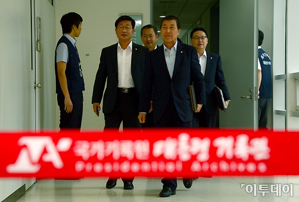 2007년 남북정상회담 대화록 원본의 존재 여부가 22일 결정된다. 여야는 대화록 재검색 마지막날인 21일에도 대화록을 확인하는 데 주력해 대화록 존재 유무에 따라 정치적 파장이 예상된다. 22일 오전 성남시 수정구 국가기록원을 방문한 여야 열람위원인 전해철 민주당 의원(왼쪽부터), 박남춘 민주당 의원, 황진화 새누리당 의원, 조명철 새누리당 의원이 열람실로 향하고 있다. 노진환 기자 myfixer@