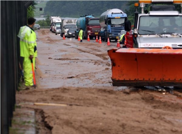 중부지방에 쏟아진 폭우로 영동고속도로 주요 구간이 토사 유출로 한때 통제됐다.