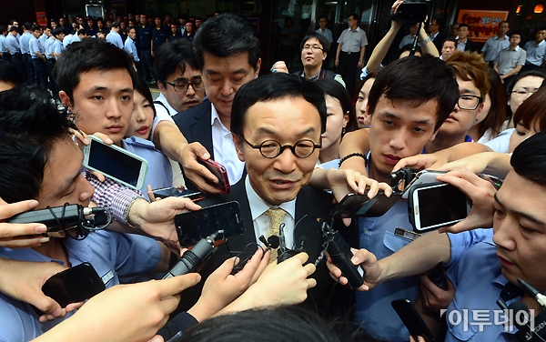 이건호 신임 KB국민은행장이 22일 오후 서울 여의도 KB국민은행 본점에서 열릴 예정이던 취임식에 참석하려 했지만 노조원들의 저지로 무산됐다. 이건호 행장이 발길을 돌리며 취재진의 질문에 답하고 있다. 노진환 기자 myfixer@