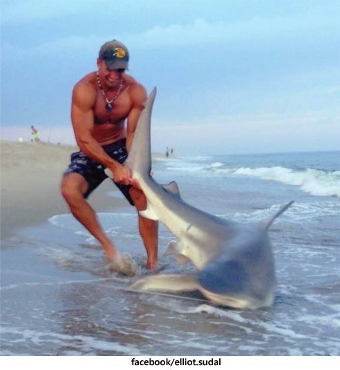사진 속에는 한 근육질의 남성이 상어의 꼬리를 잡아 당기면서 해변가로 끌고 나오는 모습이 보인다. 이 남성이 낚은 상어는 길이 2m, 무게 90kg에 달했다. 그는 미국 메사추세츠 낸터킷에 살고 있는 24세의 엘리엇 서달로 해변에서 낚시를 즐기다 상어를 낚은 것으로 알려졌다.