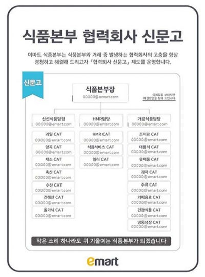 이를 위해 이마트 식품본부는 식품본부장을 포함해 식품본부 전 관리자가 참석하는 협력회사 고충 해결위원회를 구성했다. 또 전 협력회사에 매입본부장, 담당임원 3명, 매입팀장 18명 등 식품본부 팀장 이상 모든 관리자의 직통 이메일을 ‘협력회사 신문고 제도’운영에 대한 공문과 함께 발송했다.