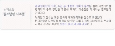 뉴지스탁 퀀트랭킹 시스템을 통해 율촌화학이 모멘텀 87점, 펀더멘탈 86점 등 종합점수 87점을 얻어 23일 유망종목에 선정됐다.