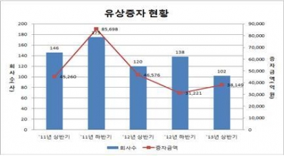 한편 무상증자는 37개사, 1억5272만주로 작년 동기보다 회사수는 14%, 주식수는 29.7% 각각 감소했다. 이 중 유가증권시장 상장사는 15개사(7373만주), 코스닥시장 상장사는 22개사(7899주)로 조사됐다. 무상증자를 많이 한 상장사로는 골든브릿지투자증권, 도화엔지니어링, 파트론, 한서예스24홀딩스, 리노공업 등이 꼽혔다.