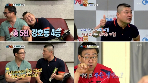 이에 이만기는 “자기가 진 거 얘기하는 거야?”며 웃으며 말하지만, 강호동은 "교수님이 뭘 그렇게, (저한테) 몇 번 진 거 가지고"라고 말하며 5전 4승에 빛나는 자신의 전적을 자랑했다.