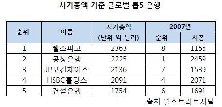 공상은행은 같은 기간 시총이 2459억 달러에서 2225억 달러로 줄었다. 공상은행은 2007년 정점 당시 시총이 무려 3740억 달러에 달했다고 캐피털IQ는 밝혔다.