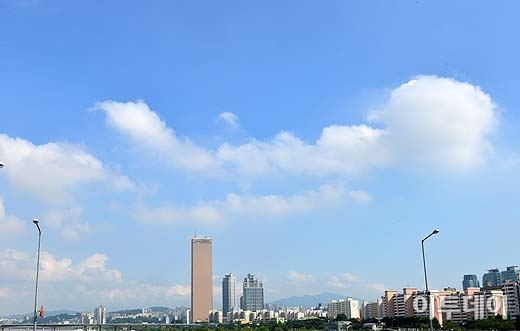 장마가 소강상태를 보인 24일 오후 서울 마포대교에서 바라본 여의도 63빌딩위의 하늘이 파랗다. 기상청에 따르면, 서울과 경기, 충청등 중부지방은 고기압의 영향으로 당분간 맑은 날씨를 유지할 것으로 보이며, 경남과 전남 등 남부지방은 제주도와 남해안지역에 비가 오며 그 밖의 지역은 폭염과 열대야가 이어지겠다고 밝혔다. 방인권 기자 bink7119@