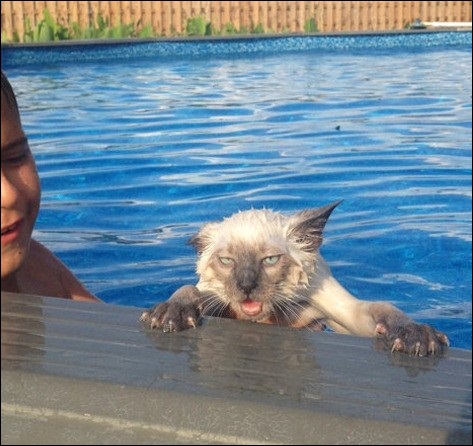 이 사진에 등장하는 고양이는 물에 흠뻑 젖어 매우 화가 난 모습이다. 어린 주인의 짖궂은 장난으로 수영장에 빠지자 분노한 표정을 짓고 있는 것.