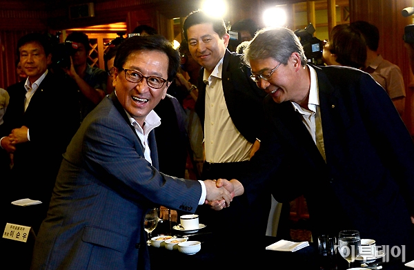 최수현 금융감독원장이 25일 오전 명동 은행회관에서 열린 금융지주회사 CEO와의 간담회에 참석하며 임종룡 NH농협금융지주 회장 등과 인사하고 있다. 노진환 기자 myfixer@