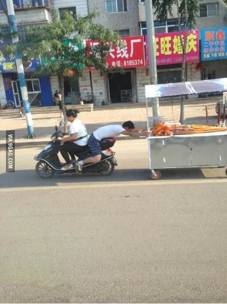 공개된 '포장마차 이동방법' 사진 속에는 기발한 방법으로 오토바이로 포장마차를 끌고 가는 부부의 모습이 담겨 있다. 손에 잡은 포장마차를 놓치지 않기 위해 상체를 숙인 채 빨을 뻗어 붙잡고 있는 남편의 모습이 안쓰럽기까지 하다.