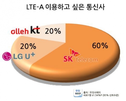 전체 응답자 중 LTE-A를 사용 할 의향이 있다고 대답한 응답자(61.7%, 2507명)가운데 59.8%가 SK텔레콤을 통해 LTE-A 서비스를 이용할 의사를 밝혀 LG유플러스(20.6%), KT(19.7%)에 비해 3배 정도로 높은 수치를 보였다.