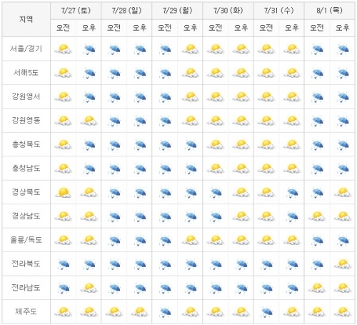 충청 지역은 27일 낮부터 비가 시작돼 29일까지 비가 이어지겠고, 8월1일에 다시 비가 시작될 전망이다.