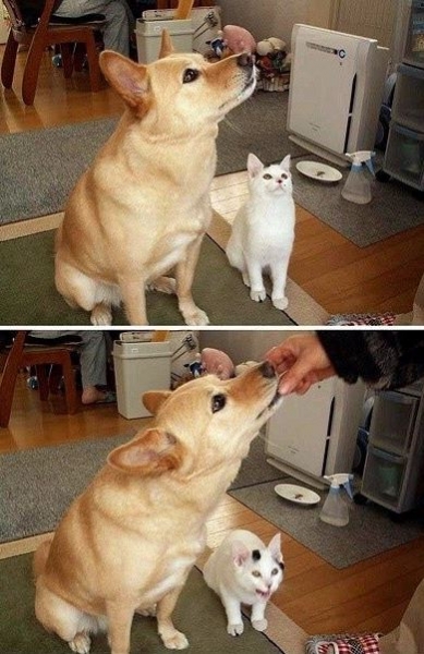 게시물에는 주인을 올려다 보고 있는 개와 고양이가 등장한다. 주인이 먹을 것을 줄 기미가 보이자 서로 받아 먹으려고 고대하는 모습이다.