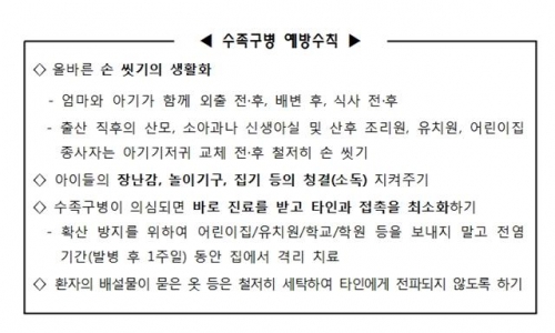 질병관리본부 관계자는 "어린이집, 유치원 등을 대상으로 올바른 손씻기, 장난감 소독 철저 등의 예방수칙을 준수하도록 독려하고 일선 보건소를 통해 주민들을 대상으로 지속적인 교육, 홍보활동을 강화해 나갈 계획"이라고 말했다.