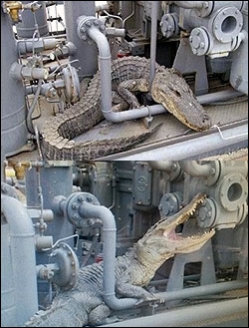 온라인 커뮤니티 등을 통해 퍼지고 있는 '삼성중공업 악어' 사진에는 한 산업 현장에서 거대 기계 사이에 끼어 있는 악어의 모습이 담겨 있다. 사진 속 악어는 무시무시하게 생긴 입을 쫙 벌려 기계를 물어뜯고 있어 섬뜩함을 자아낸다.