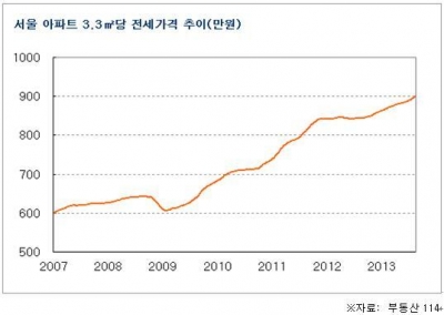 서울 아파트의 3.3㎡당 전세가격은 2007년 초(1월 5일) 기준 600만2600원으로 600만원을 넘어선데 이어 2010년 2월 26일 기준 701만7800원을 기록해 700만원 대에 안착했다.