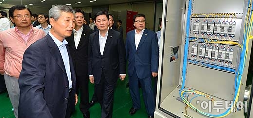 최경환 새누리당 원내대표를 비롯한 새누리당 관계자들이 26일 오후 새누리당 중소기업 민생탐방 두 번째 순서로 경기 안산시 단원구 목내동 ㈜광명전기를 방문해 현장을 둘러보고 있다. 방인권 기자 bink7119@