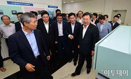 최경환 새누리당 원내대표외 김기문 중소기업중앙회 회장을 비롯한 새누리당 관계자들이 26일 오후 새누리당 중소기업 민생탐방 두 번째 순서로 경기 안산시 단원구 목내동 ㈜광명전기를 방문해 이재광 대표이사의 설명을 듣고 있다. 방인권 기자 bink7119@