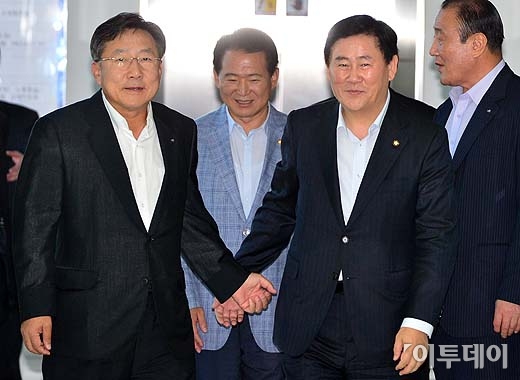 김기문 중소기업중앙회 회장과 최경환 새누리당 원내대표를 비롯한 새누리당 관계자들이 26일 오후 새누리당 중소기업 민생탐방 두 번째 순서로 경기 안산시 단원구 목내동 ㈜광명전기를 방문해 간담회 장소로 이동하고 있다. 방인권 기자 bink7119@