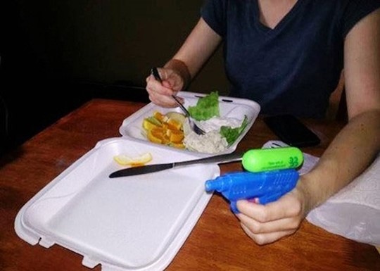 최근 한 온라인 커뮤니티에는 ‘고양이 접근 막는 법’이라는 제목으로 사진이 올라왔다. 공개된 사잔 속에는 한 여성이 오른손으로는 밥을 먹고 왼손에는 물총을 쥐고 있는 모습이 담겨있다.