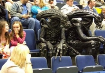 외계인 옆에 앉은 어린이들은 외계인에 대해 이야기하는 듯 보이지만, 그밖에 다른 관중들은 크게 신경을 쓰지 않는 모습이다. 물론 실제 외계인은 아니고, 재미있는 코스프레다.