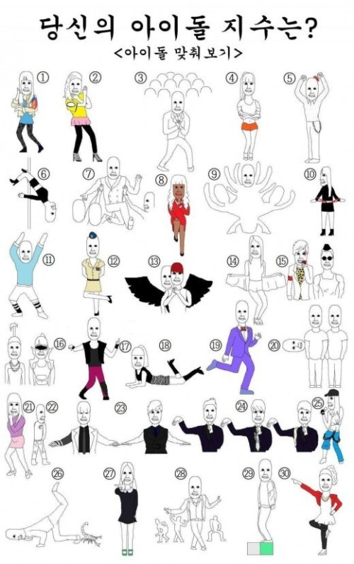 공개된 사진 속에는 한국 아이돌의 특징을 포착한 30가지의 그림이 등장한다. 동방신기, 싸이, 포미닛, 아이유, 슈퍼주니어, 걸스데이, 씨스타 등 인기 아이돌 및 가수들이 총출동한다.