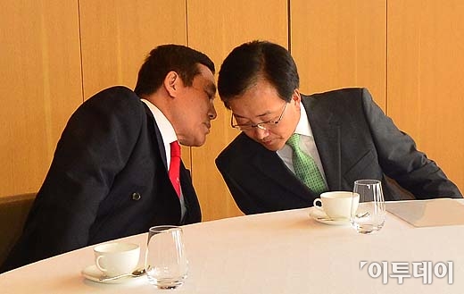 서울상공회의소 회장단 회의가 29일 오전 서울 소공동 롯데호텔에서 열렸다. 이날 열린 회장단 회의에서 신박제 엔엑스피반도체 회장이 이동근 대한상의 상근부회장과 이야기를 나누고 있다. 방인권 기자 bink7119@