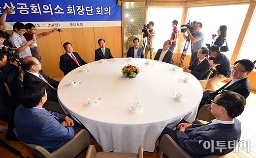 서울상공회의소 회장단 회의가 29일 오전 서울 소공동 롯데호텔에서 열렸다. 이날 회의에 참석한 회장단(심경섭 한화 사장, 강호문 삼성전자 부회장, 김 원 삼양홀딩스 부회장, 이동근 대한상의 상근부회장, 신박제 엔엑스피반도체 회장, 지창훈 대한항공 사장, 김희용 동양물산기업 회장, 이인원 롯데그룹정책본부 부회장, 김 윤 대림산업 부회장, 김영대 대성산업회장)이 서울상의 회장 선출 논의를 하고 있다. 방인권 기자 bink7119@