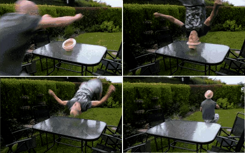공개된 '신개념 모자쓰기'영상에는 한 남성이 순식간에 텀블링으로 테이블 위에 있는 모자를 쓰는 장면이 고스란히 담겨 있다.
