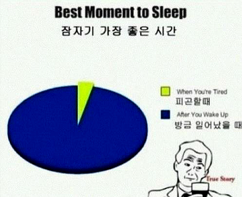 사진은 잠자기 가장 좋은 시간으로 '피곤할 때'보다 '방금 일어났을 때'라고 부연 설명하고 있다.