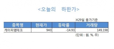 29일 국내 주식시장에서는 코스닥상장사인 케이피엠테크만이 홀로 하한가를 기록했다.