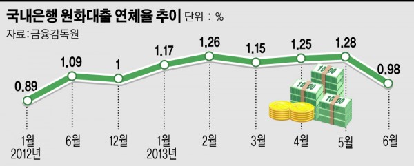 국내은행의 원화대출 연체율이 반기결산 마감을 앞둔 은행들의 부실채권 정리 등 계절적인 요인으로 올해 들어 최저치로 떨어졌다. 기업대출 연체율 1.09%로 일부 구조조정 대상 기업여신에 대한 정상화와 적극적인 매·상각을 통해 0.39%의 하락폭을 보였다. 가계대출 역시 신규연체 축소와 연체정리 확대에 기인해 0.18%포인트 감소폭을 보였다.