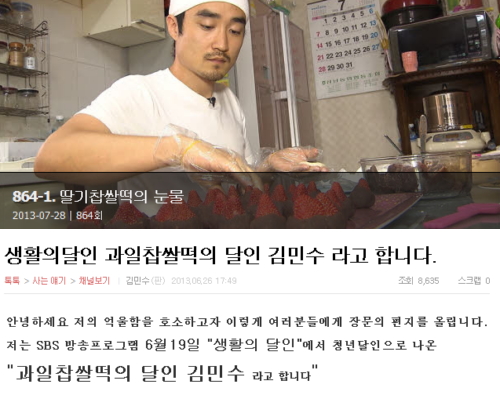 MBC '시사매거진 2580-딸기찹쌀떡의 눈물' 방송에 앞선 지난달 26일 한 인터넷 포털사이트 게시판에 '생활의달인 과일찹쌀떡의 달인 김민수라고 합니다'란 글이 공개됐다.