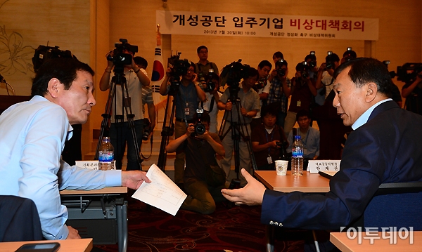 개성공단 출입차단 119일째를 맞는 30일 오전 서울 여의도 중소기업중앙회에서 열린 개성공단 입주기업 비상대책 회의에서 한재권 비상대책위원회 공동대표위원장(오른쪽)이 관계자와 심각하게 이야기를 나누고 있다. 개성공단 정상화 촉구 비상대책위원회는 이날 오전 서울 여의도 중소기업중앙회에서 전체 입주 기업인들이 참석하는 비상대책 회의를 개최해 공단 정상화를 위한 남북 실무회담이 최근 결렬된 것과 관련, 입주기업들의 입장을 발표할 예정이다. 노진환 기자 myfixer@